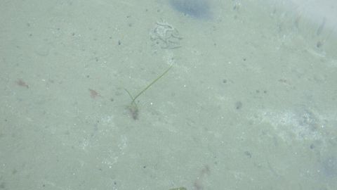 アマモ場(だった場所)でかろうじて見つけたアマモ。アマモ場の衰退が著しいです。